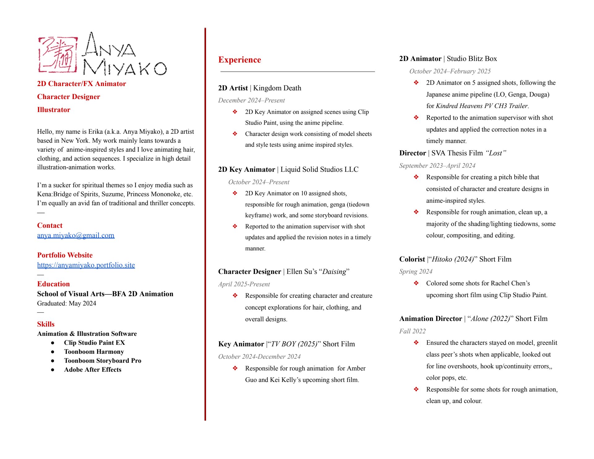 Hello, my name is Erika but I like to go by Anya Miyako as my online presence. Experienced in 2D character/FX animation and character design in anime styles. I specialize in high detail, illustration-like animation. Some of my favourite things are Japanese/Korean foods, matcha, Godzilla, and film photography. I mainly take inspiration from spiritual themed media and folklore from my hometown in the Philippines.